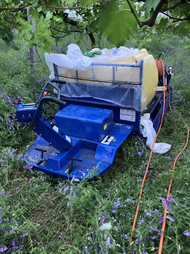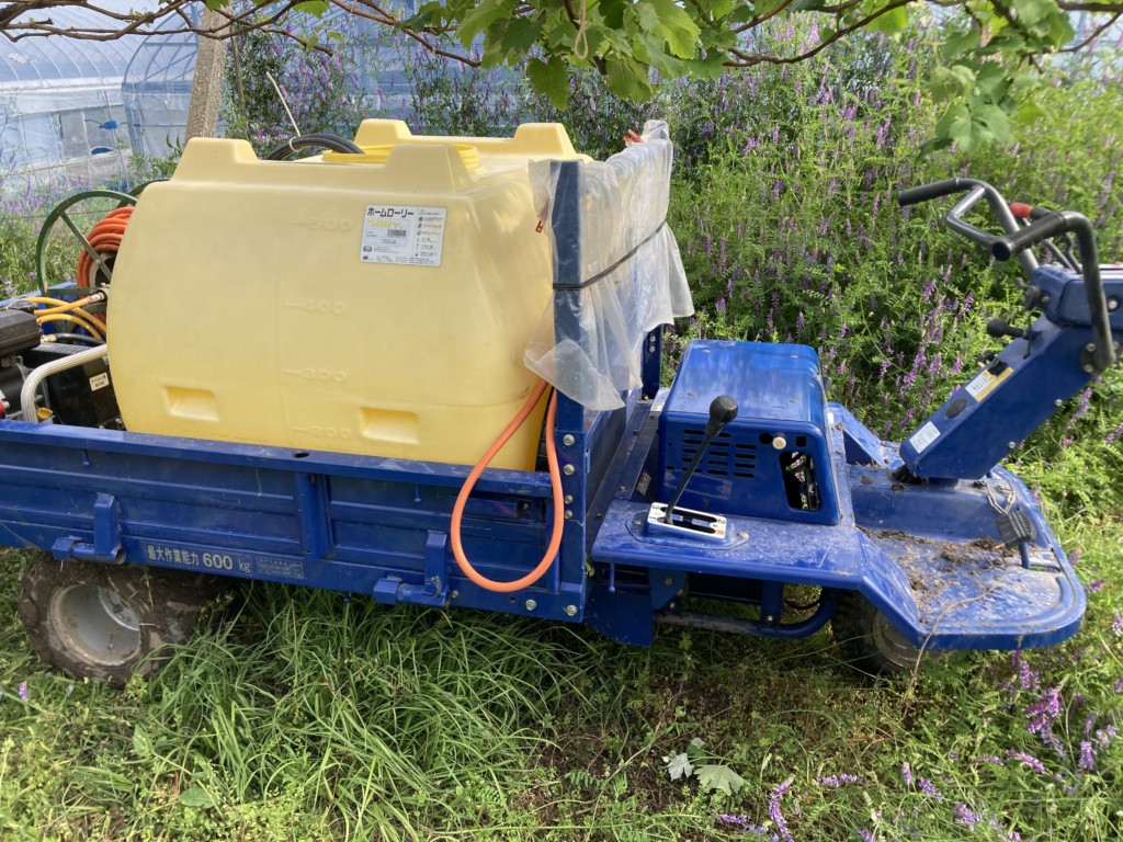 まず3月にSS/スピードスプレーヤーが壊れてしまい、修理に出したのですが、高額の修理代金が必要になり、新たに防除をする機械が必要になりました。SSはとても高いので、現在手元にある運搬機に噴霧器とタンクを乗せて防除することにしました。その途端、運搬機が畑の明渠/溝にはまってしまいました。