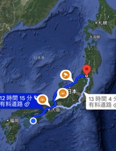 途中に、自衛隊の特殊車両が道を塞いで高速を60-70kmでずっと走らされたり、事故渋滞を抜けた先に完全に燃え尽きたバスがあったりして、気を引き締めながらの道中でした。