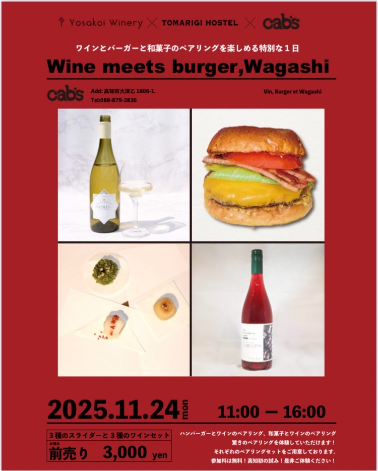 そして、11月はその後、イベント続き。10月のCLS高知で会った、和菓子のはるちゃんとコラボイベントを実施。以前から、大津のおいしいハンバーガー屋cabsさんと、ハンバーガー×ワインのコラボをやろうと相談していたので、そこに相乗りする形でワインペアリングイベントを開催。