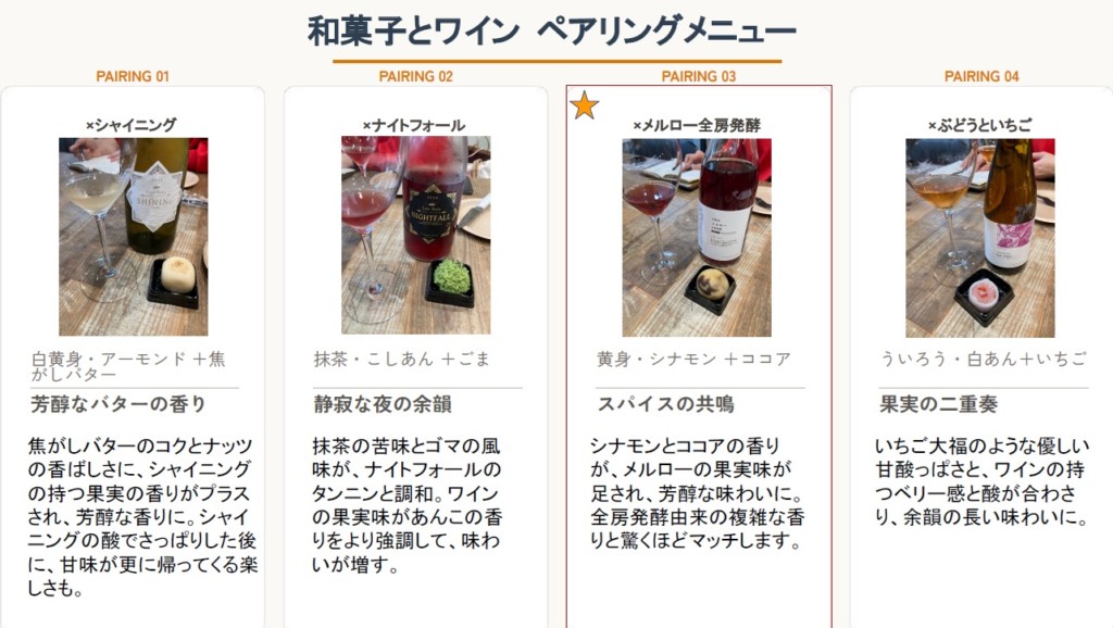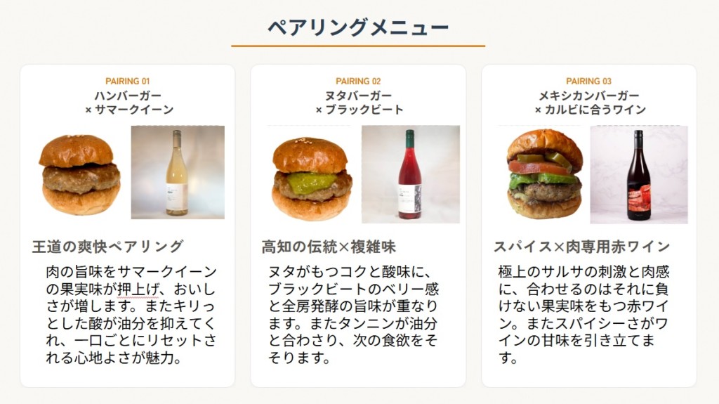 3回にわたるペアリングの試食を行い、和菓子の調整をしていただいて、イベントに臨みました。cabsさんのハンバーガーは、お肉自体も美味しいんですが、バンズや味付けも全体的に優しい味わいなので、よさ来いワイナリーのワインととても合いました。cabsさん、はるちゃんありがとうございました。
